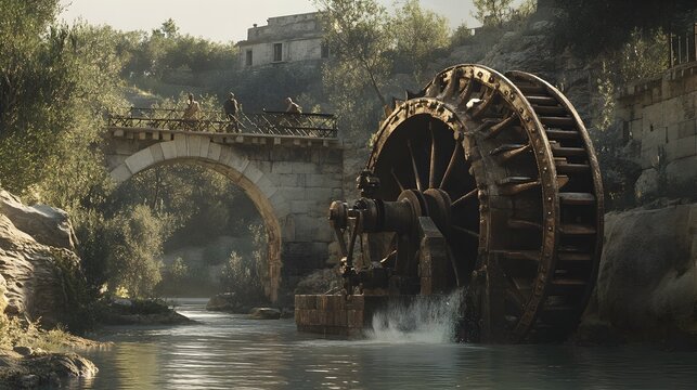Archimedes Screw Mechanism Lifting Water in Ancient Greek Riverside Landscape