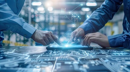 Engineer and architect analyze project under construction with new technology and innovation on digital tablet and network of construction icons on futuristic virtual interface.