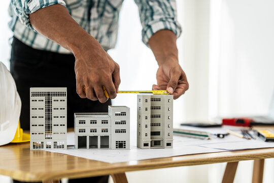 Close up Asian individual architect or engineer holding building scale model of multi-story building. design or review of architectural plans laid out on work surface in front of them.