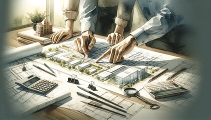 Architect reviewing plans of his design or architectural project in his studio or workspace.