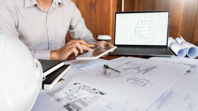 Architect Engineer Design Working on Blueprint Planning Concept. Construction Concept