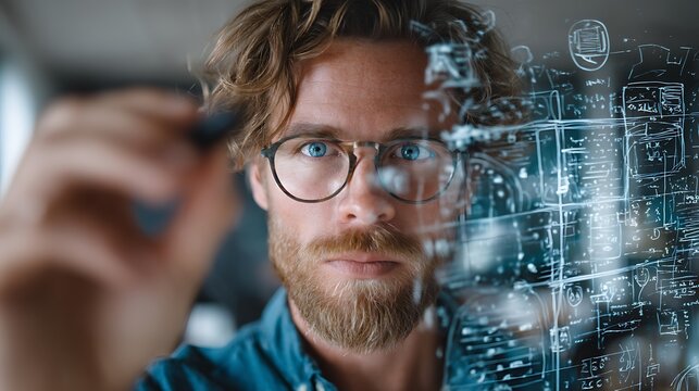 Architect examining data code and smartphone in a technology environment