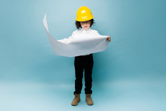 Architect reviewing detailed residential blueprint on wooden desk in sunlight wearing glasses