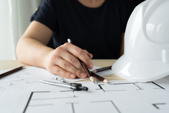 Female architect or interior designer. Woman working on home floor plans, structural building blueprint projects. Hard hat safety helmet lying on the table. Design studio desk scene.