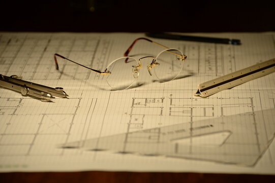 夜に自宅で建築の設計製図の作業風景(休憩中) A scene of architectural drafting work at home at night (during a break)