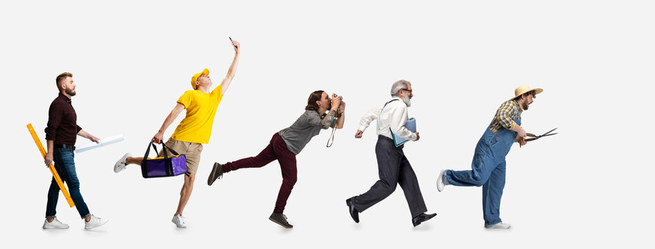 Collage of running men, professor, farmer, delivery man, cameraman and architector isolated on white studio background. Horizontal flyer, collage
