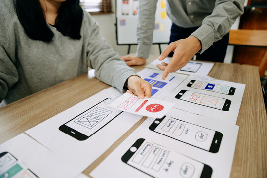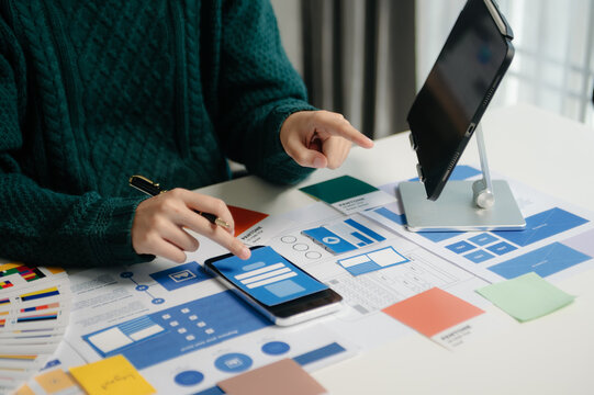 UX graphic designer planning application process development prototype wireframe for web smart phone. Creative digital development agency. in office