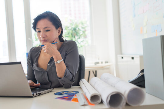Architect examining project plans on laptop in sunlit office