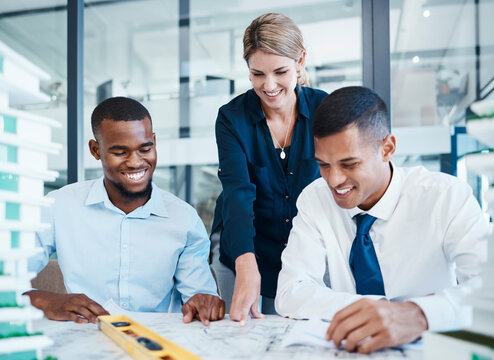 Architects or corporate engineers working on building construction in meeting, planning blueprint and looking at home renovation paperwork. Smiling colleagues drawing a design, doing job and laughing