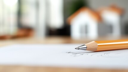 A close-up shot of a yellow pencil on a white paper, with small blurred house models in the background, illustrating a concept of home design and creativity.