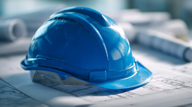 Blue construction helmet resting on architectural blueprints symbolizing building safety and project planning on an engineering workspace table