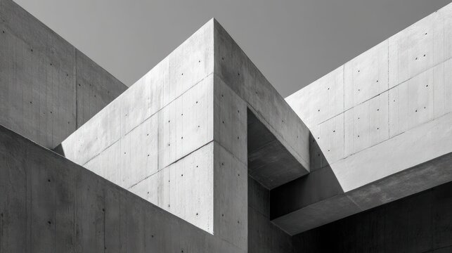 A stark, black and white photograph showcases a complex architectural intersection of concrete walls and beams. The image focuses on the sharp angles and geometric forms of the structure,