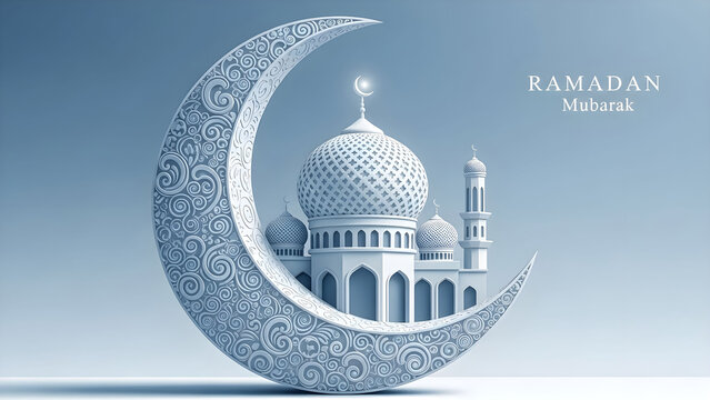Stunning white architectural rendering of an ornate crescent moon framing a mosque dome and minarets wishing ramadan mubarak greeting elegantly