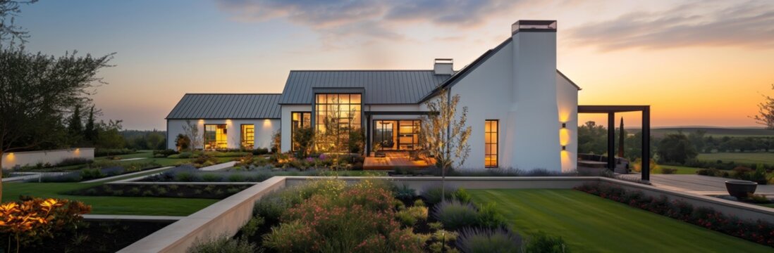 Modern House with Garden at Sunset