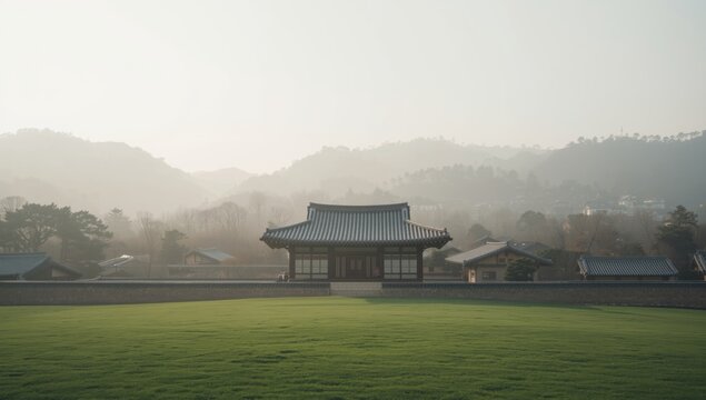 Traditional chinese gate in serene mountain landscape at sunset