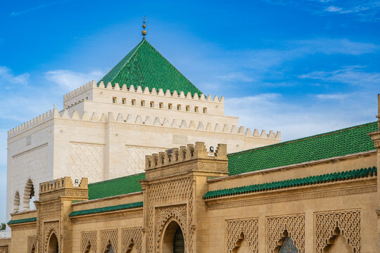 Majestic architectural building with green roofs against a bright blue sky. Rabat, Morocco