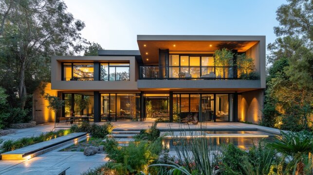 Modern architectural masterpiece with large glass windows set against a vibrant sunset backdrop