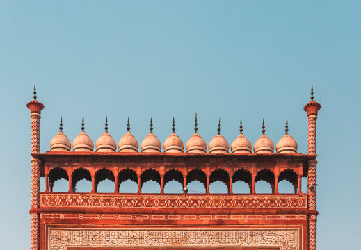 View of the iconic Taj Mahal with intricate design and beautiful architecture, Agra, India.