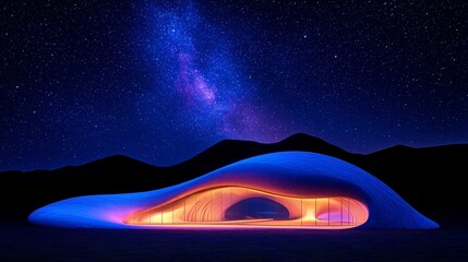 Futuristic architectural masterpiece glowing under a starry night sky with vibrant colors