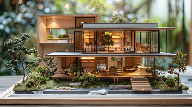 An innovative interior design layout with an architectural model, showcasing home insurance benefits