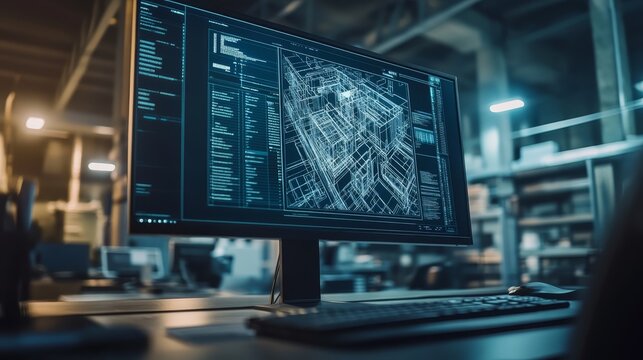 Computer Screen Showing  D Model of Building Design in Office Workspace
