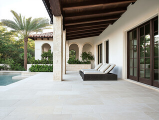 Spacious backyard with pool and lounge chairs, white marble pavers, stone walls in modern farmhouse style at large home in West Virginia