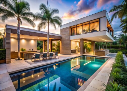 Modern villa with a luxurious swimming pool illuminated at night, stylish architectural design perfect for real estate and vacation ideas