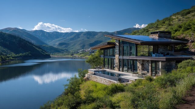 a modern architectural marvel nestled amidst lush mountains and a serene lake showcasing contemporary design and breathtaking natural scenery high quality professional detailed elegant stylish clean