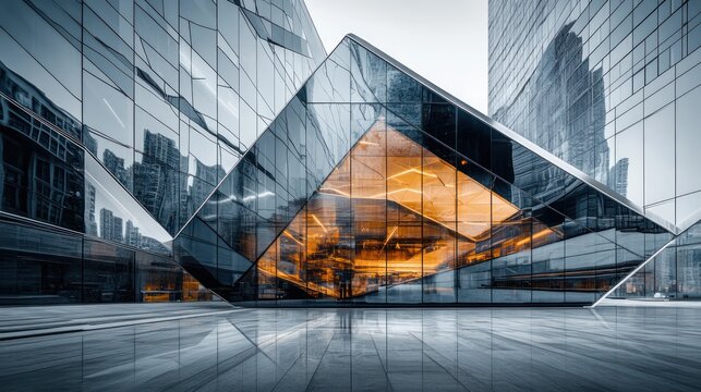 Abstract geometric facade of modern skyscraper reflecting urban environment