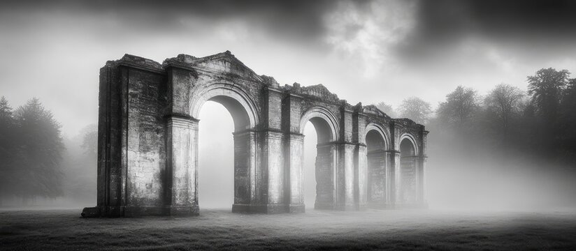 Historic ruins in a misty black and white landscape capturing architectural elegance and timeless beauty in a serene park setting