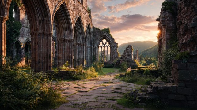 Lost in Time's Embrace: An ancient abbey ruin stands gracefully against a backdrop of a picturesque landscape, its aged stones whispering tales of a bygone era.