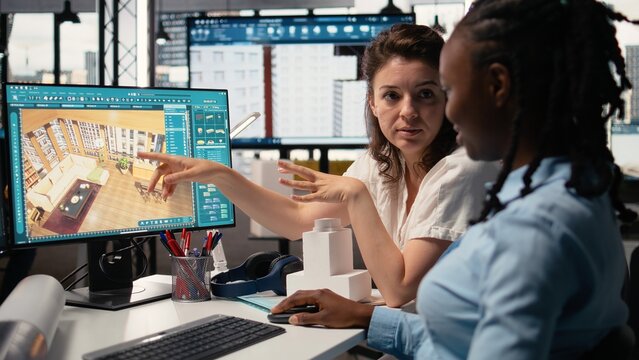 Diverse designers engineers using AI neural networks to help create interior design of a new apartment building, architectural software for a floor plan at workstation. Dual monitors.