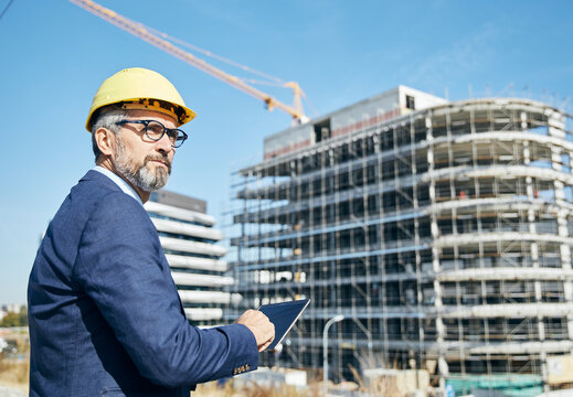 civil engineer or architect with hardhat on construction site checking schedule on tablet computer