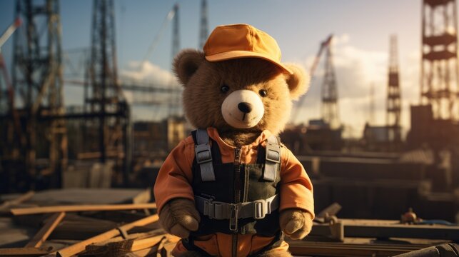 A bear toy dressed in construction gear on a construction site. Generative AI.