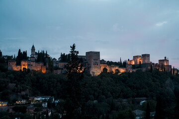 The Alhambra at dusk with lights on in Granada, Spain
