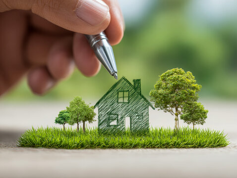 Hand sketching a house illustration on a miniature green grass patch with small trees symbolizing eco-friendly living and sustainable home concept