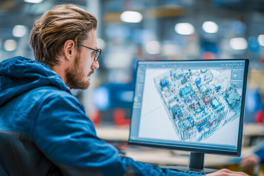 Engineer working on detailed 3d building design on computer in modern office environment with industrial background and focused expression
