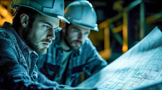 Engineers analyzing construction blueprints on a worksite at night