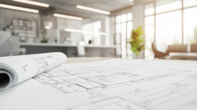 Building blueprint spread out on a desk in a modern office  on blurred background