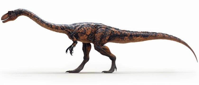 Lifelike dinosaur model of a prehistoric creature walking on a white background. Ideal for educational and scientific purposes.