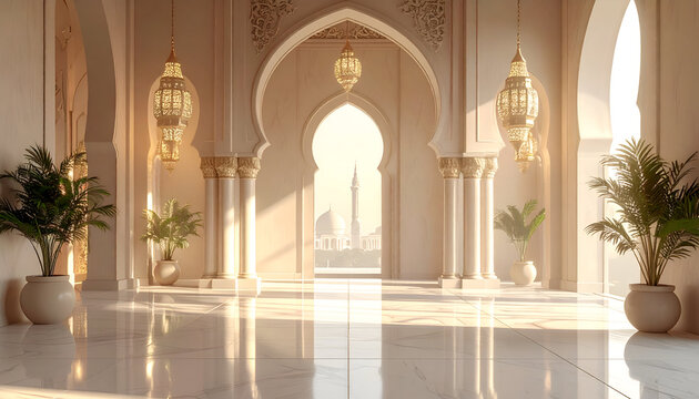Ancient ornate architectural interior features three dramatic archways casting warm glowing light across the textured floor surface