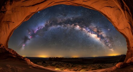 Vast Milky Way galaxy arcs across a starry night sky viewed from within a natural rock arch.