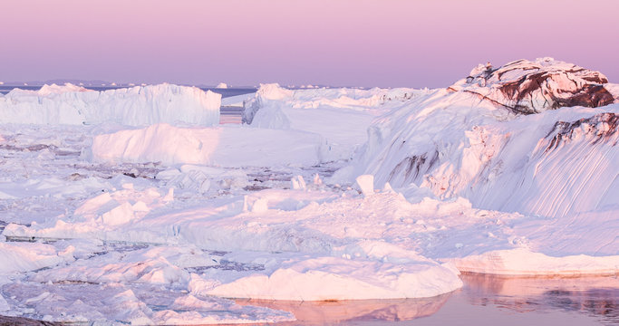 Massive icebergs floating in ancient, serene arctic waters at sunset