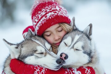 Young girl cuddling huskies outside in Lapland