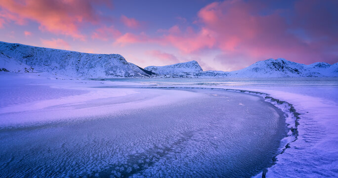 Wonderful nature image of north fjords with mountains landscape. scenic photo of winter mountains and vivid colorful sky. Picturesque Scenery of lofotens islands during sunset. Norway