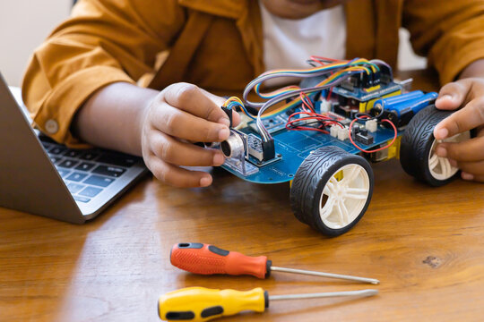 teenager students doing robot arm and robotic cars homework project in house assemble the circuit and coding. technology of robotics programing and STEM education concept.