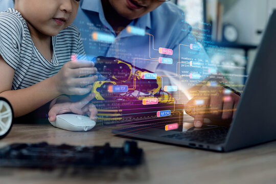 A little boy and teacher do robotic arduino project together, technology of robotics programing and STEM education concept.
