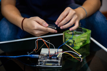 A close-up shot of someone working on an Arduino project at a messy desk. The individual is carefully connecting jumper wires to an Arduino Uno board and various electronic parts in a DIY setup.