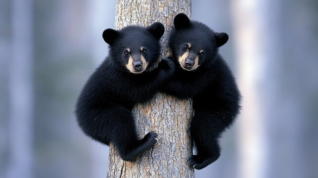 Two adorable black bear cubs are climbing a tree, curiously peeking around the trunk. This charming moment showcases their playful nature in a serene forest setting