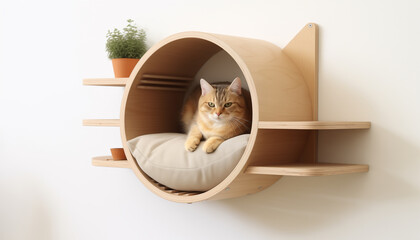 Creative round wooden house shelf for cats on wall for pet climbing activity.